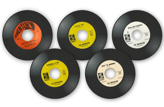 These are the singles and b-sides recorded in Los Angeles when The Unforscene had signed a record deal in 1966. These are MP3 copies of the original 45 RPM 7″ records and have not been enhanced in any way.